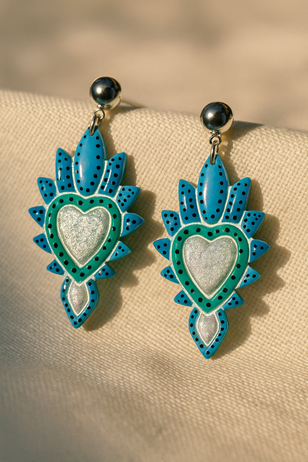 These earrings are inspired by sacred heart motifs—symbols of passion and energy brought to life through modern craftsmanship. Each piece is hand-sculpted and painted from polymer clay, a lightweight, durable, and versatile material that allows for intricate details and vibrant colors while remaining comfortable to wear.