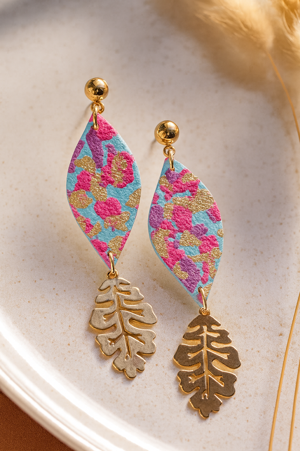It’s also hypoallergenic, water-resistant, and long-lasting, keeping its shape, color, and shine over time. The metallic leaf detail adds movement and elegance, making these earrings a handcrafted piece that celebrates the connection between art, design, and nature.