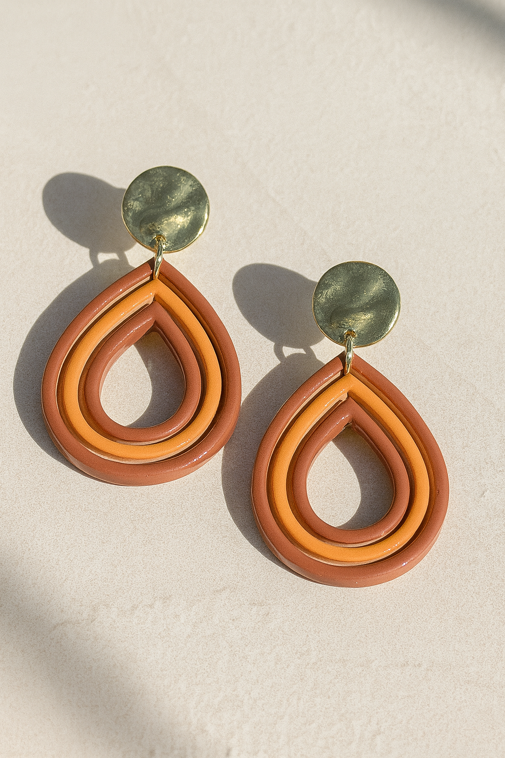 The Caramela earrings bring the cozy charm of sunlit afternoons and soft caramel tones to life. Inspired by the golden hues of nature and modern minimalism, their layered teardrop design adds depth, movement, and a touch of effortless elegance to any outfit.