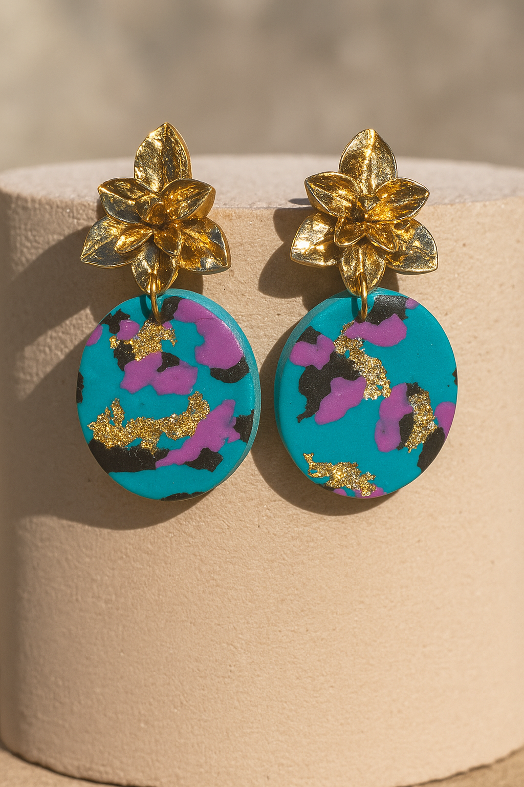 The Celestia are inspired by the magic of the evening sky, where color and light dance in perfect harmony. Each piece is handcrafted from polymer clay, a lightweight, durable, and versatile material that allows for unique blends of color and texture while ensuring comfort.