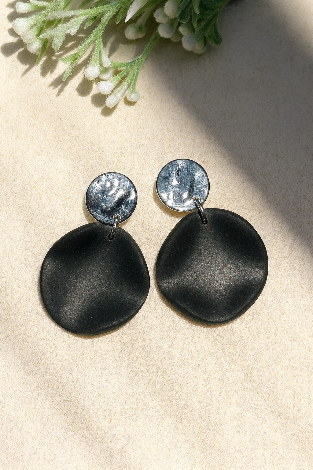 The Eclipse Drops earrings embody the quiet drama of contrast — sleek, fluid shapes inspired by the movement of light and shadow. Their organic round design and soft matte black finish create an effortlessly modern statement that balances boldness with refined simplicity.