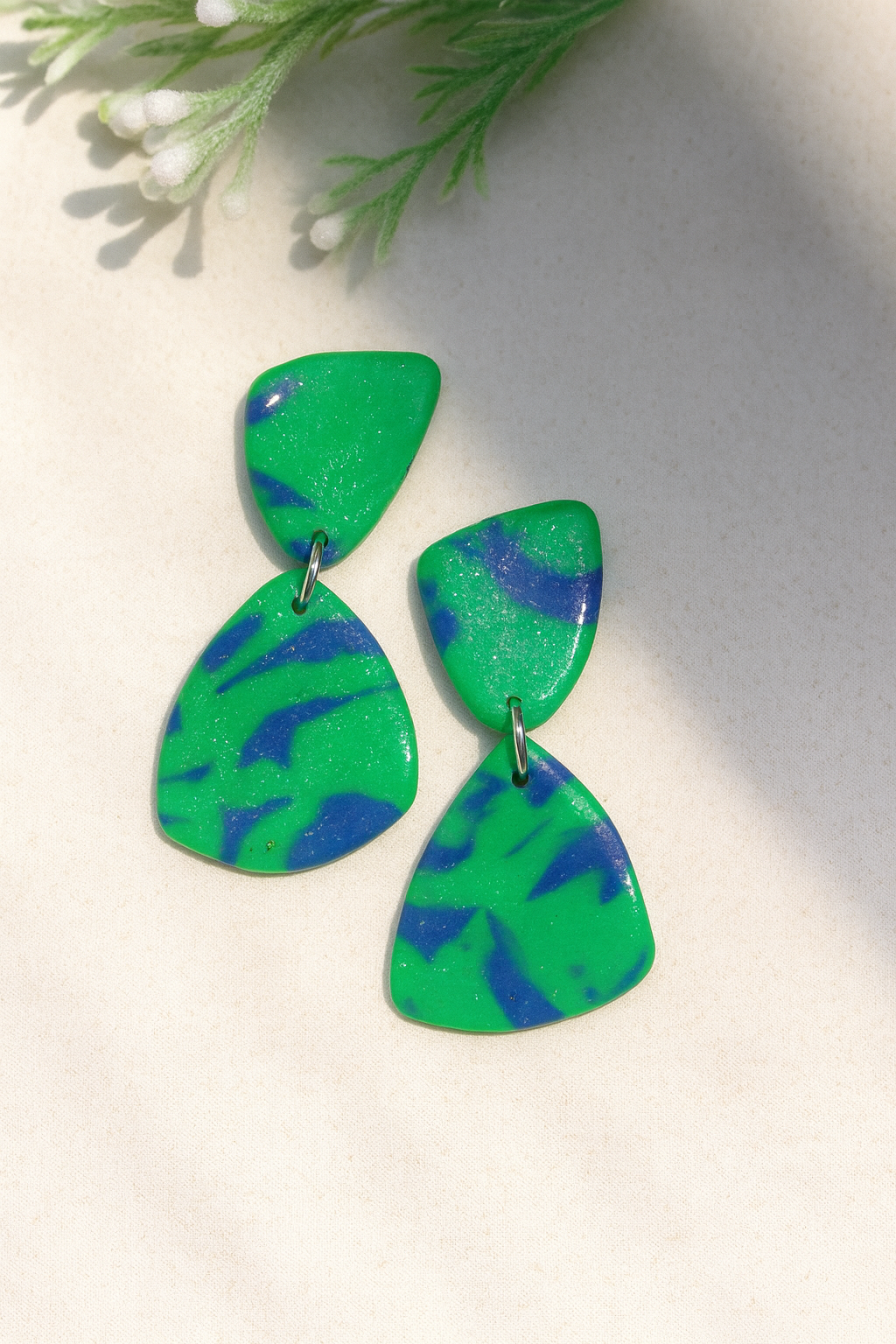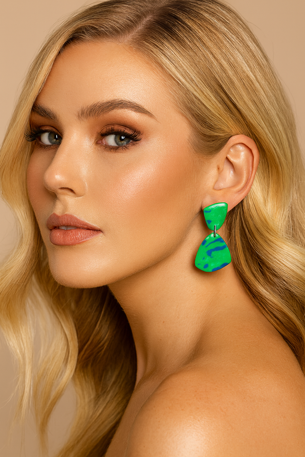 The Tropical Harmony earrings celebrate contemporary design infused with the vibrant spirit of the tropics. Their organic geometric shapes and intertwining shades of green and blue evoke freshness, balance, and creativity. Each pair is a unique composition that captures movement, artistry, and bold personality.