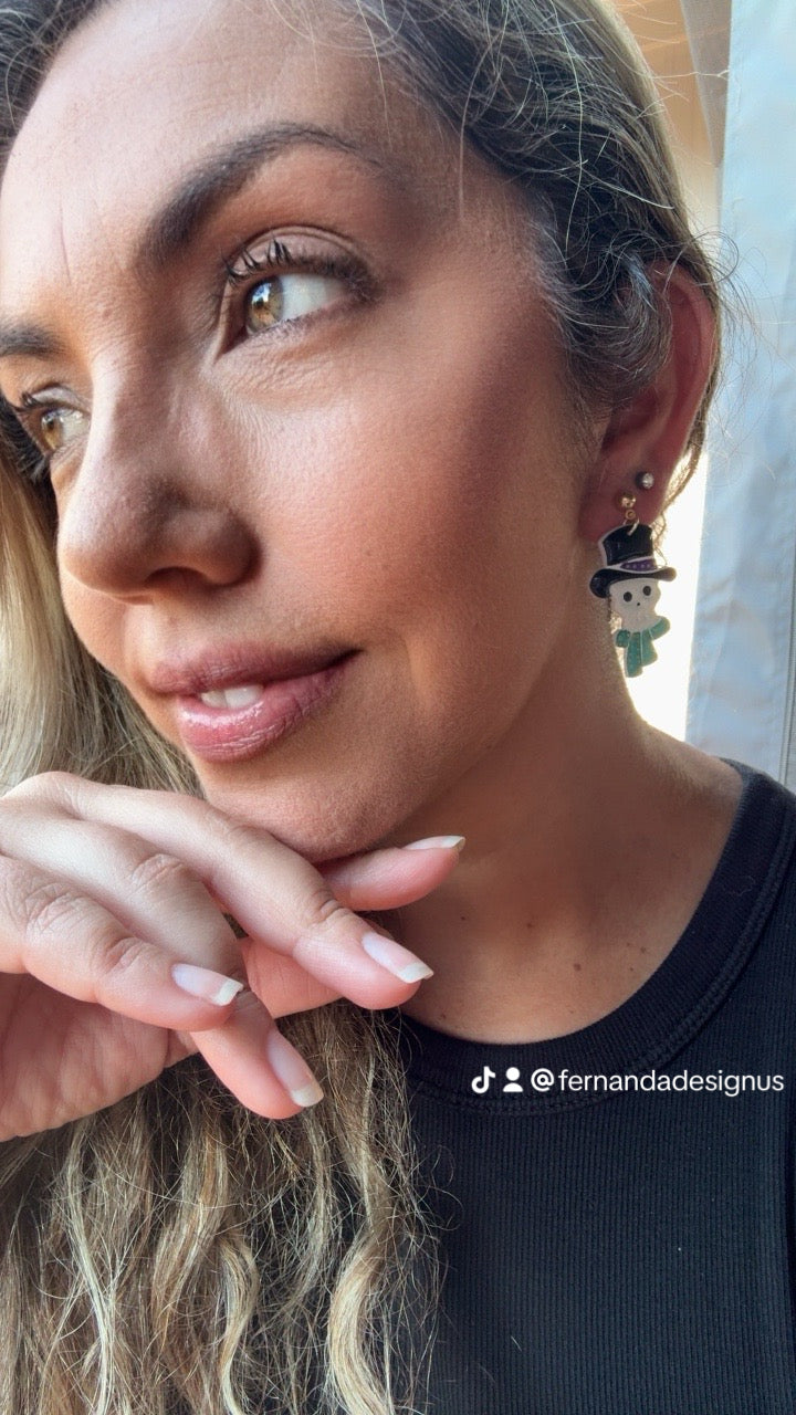 Meet Green Skully — the dapper skeleton with a flair for fun. Each piece is hand-sculpted in durable polymer clay, featuring a rosy hat and dotted scarf that add a touch of sweetness to his spooky grin. Feather-light and full of personality, these earrings bring a perfect mix of cute, creepy, and chic to your look. 💀🎀