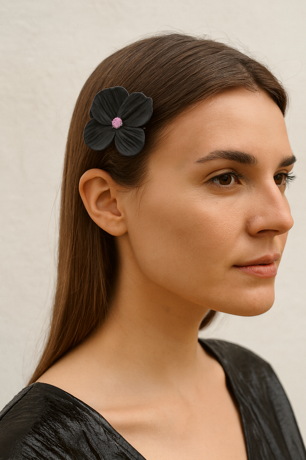 Hair clip with black metal base. Handmade flower made with polymer clay.