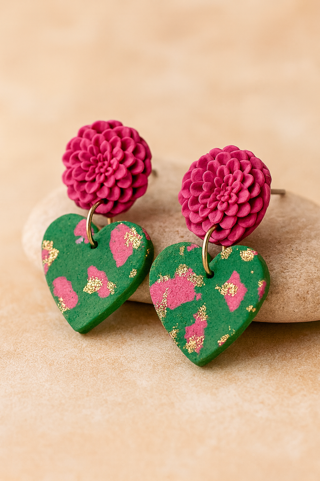 The Rosabella Earrings blend the strength of color with the sweetness of floral design. Inspired by the joy of sunny days, their fuchsia and green tones create a vibrant harmony that radiates energy and optimism. Each piece is hand-sculpted and painted from polymer clay, a lightweight, durable, and versatile material that allows for precise shapes, realistic textures, and unique color blends.