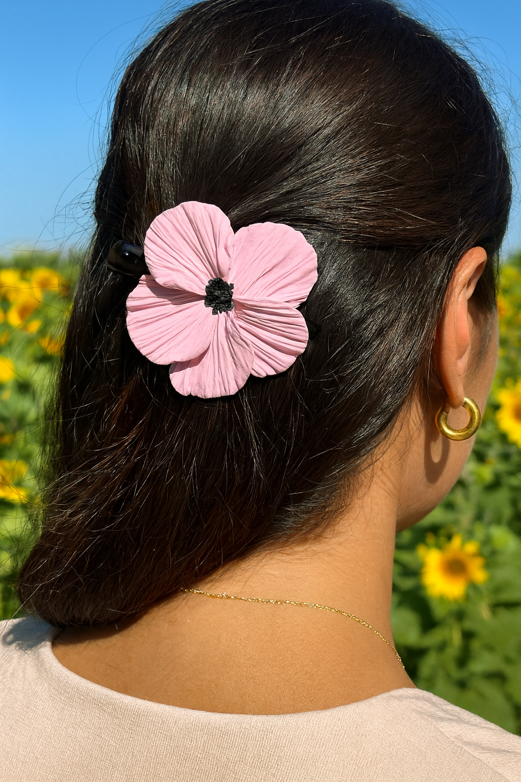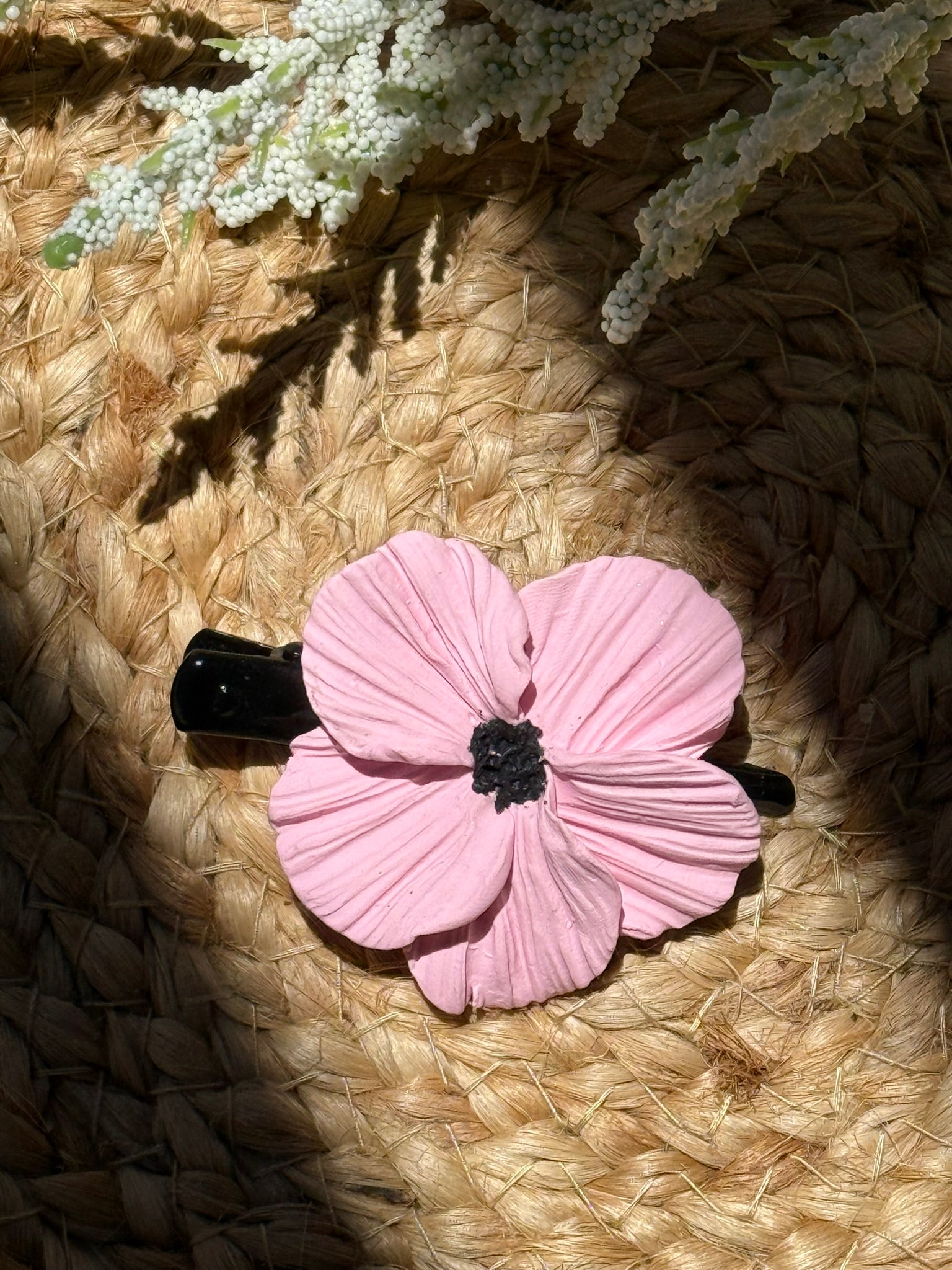 Hair clip with black metal base. Handmade flower made with polymer clay.
