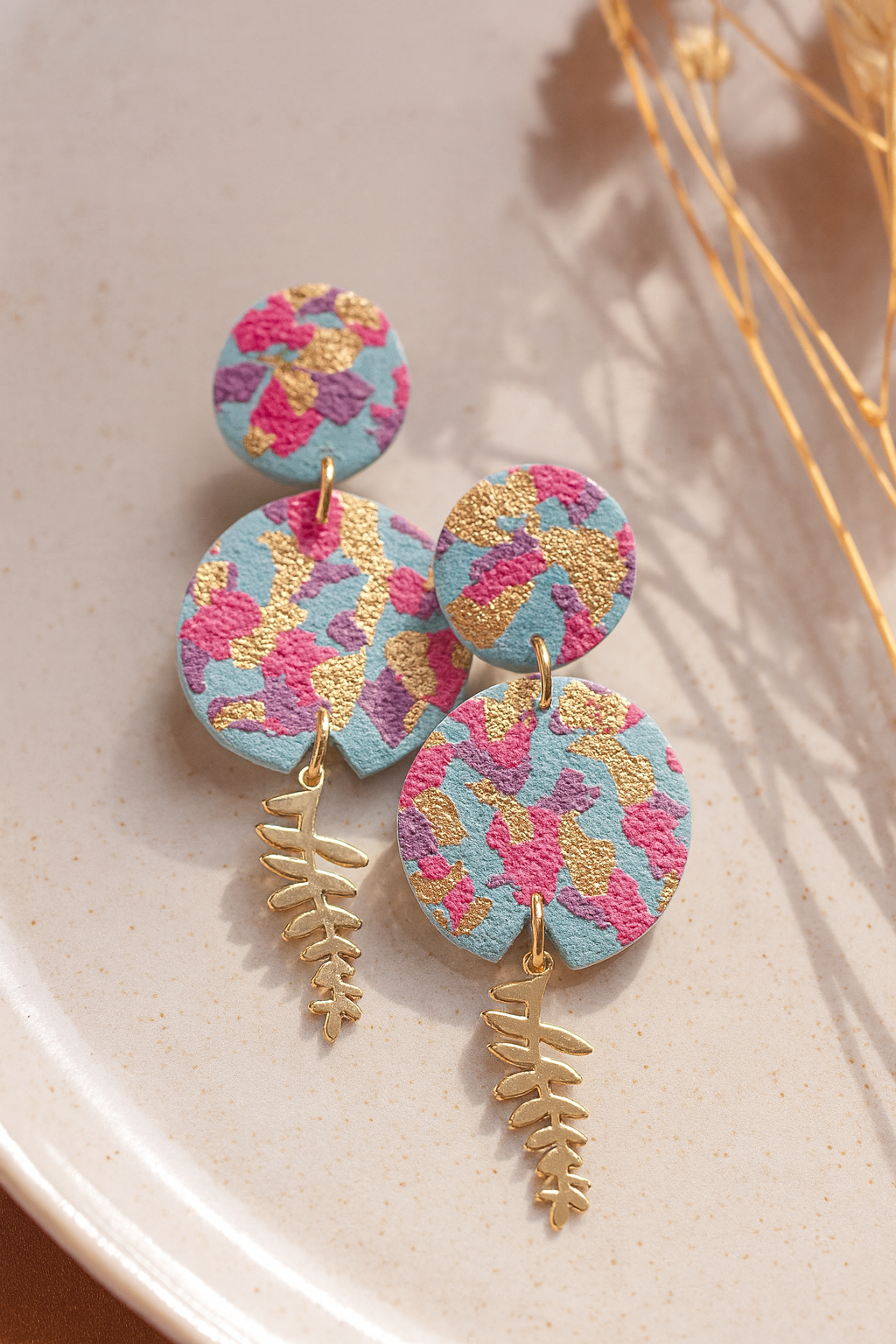 The Selva Earrings celebrate the vibrancy and diversity of nature. Their bright tones and golden accents evoke the beauty of a tropical forest kissed by sunlight. Each piece is hand-sculpted and painted from polymer clay, a lightweight, durable, and versatile material that allows for organic textures and unique color blends.