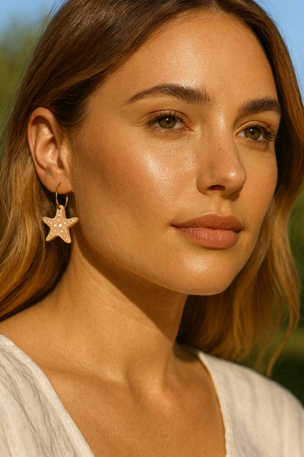 Starfish Kiss captures the essence of the ocean through a design that radiates softness, freshness, and serenity. Shaped like delicate sea stars, each earring features gentle raised details that blend natural inspiration with modern elegance. Every curve is carefully handcrafted, achieving a graceful balance between texture and form.