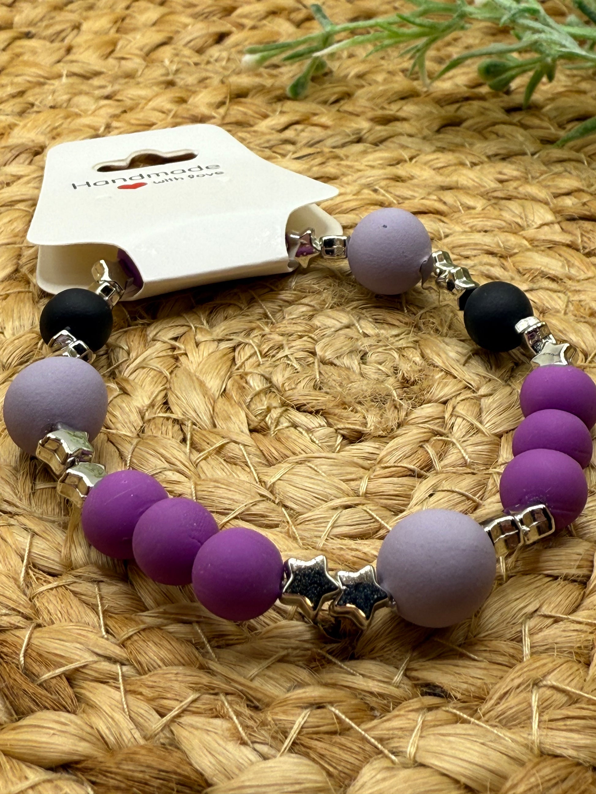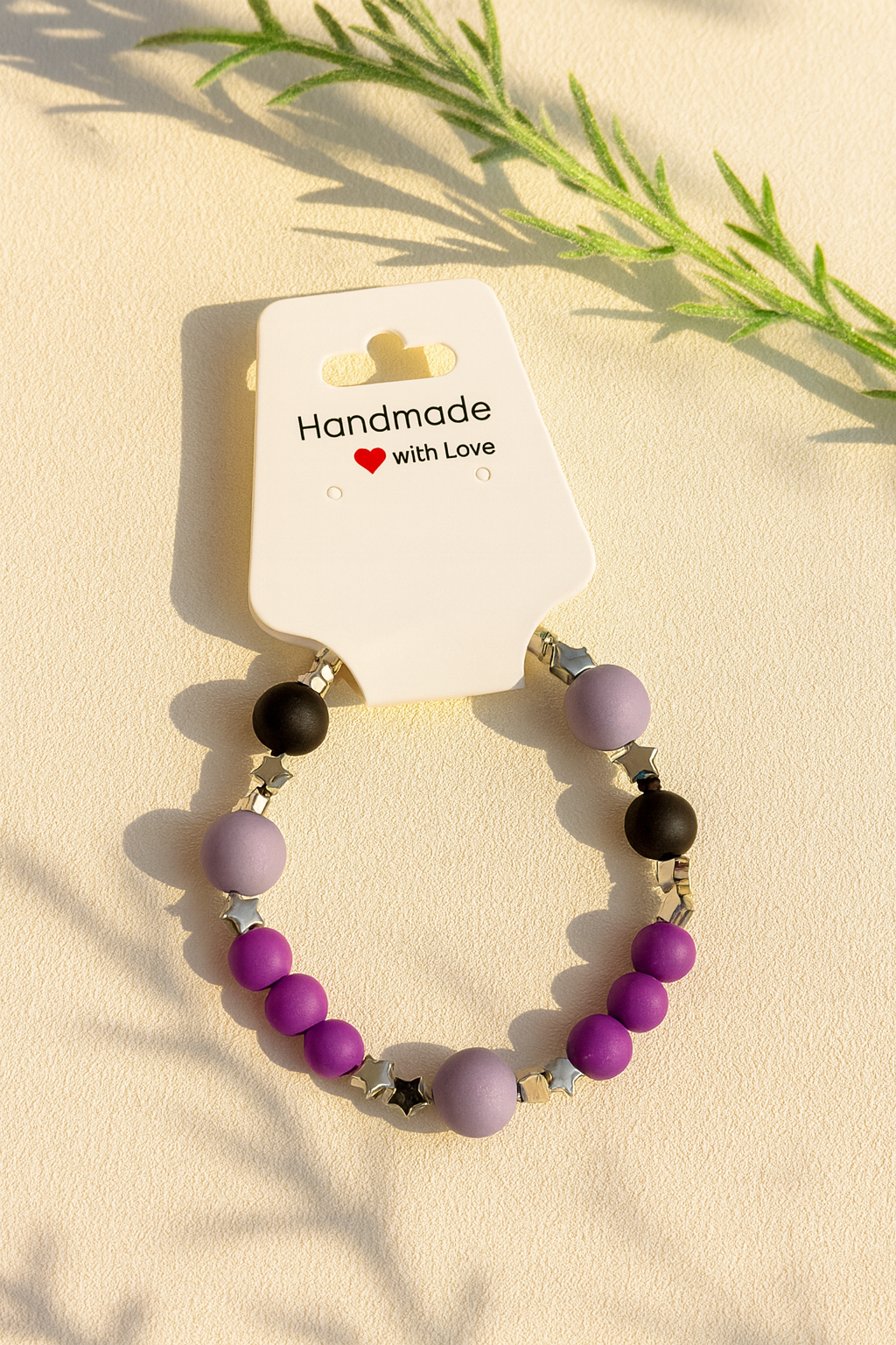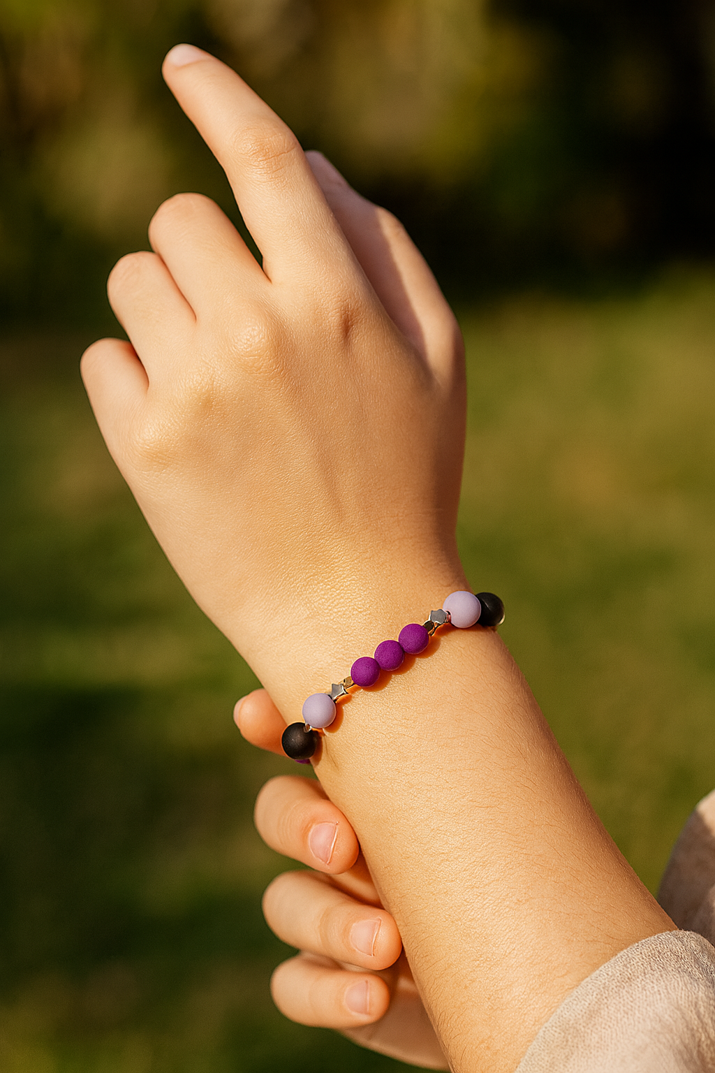 The Starlumen bracelet captures the magic of twilight — that quiet moment when colors soften, and stars begin to shimmer. Combining soft lavender, bold violet, and deep black beads with delicate silver star accents, this piece radiates balance between elegance and playful energy.