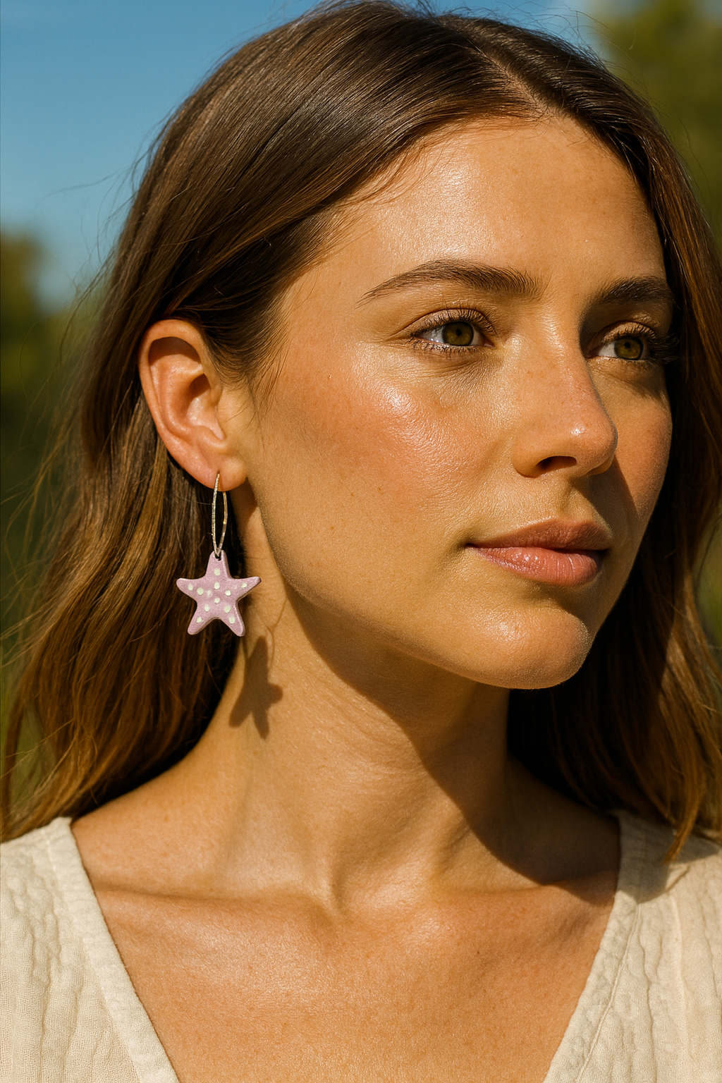 The Starry Lilac earrings capture the magic of the sea and sky in a design that radiates serenity, light, and gentle movement. Their starfish shape, in a soft lilac tone with pearlescent details, transforms the beauty of nature into a modern and enchanting piece. Each pair embodies a perfect balance of creativity, texture, and refined elegance.