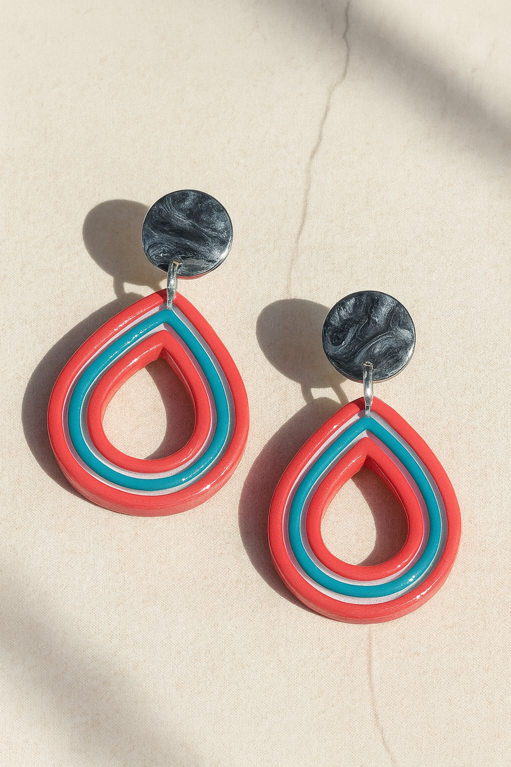 The Sunreef earrings radiate the energy of endless summer days — where the ocean meets the warmth of the sun. Their bold combination of coral red and turquoise captures the spirit of seaside adventures and carefree elegance. Designed to stand out, their layered teardrop shape adds a playful yet sophisticated movement to any look.