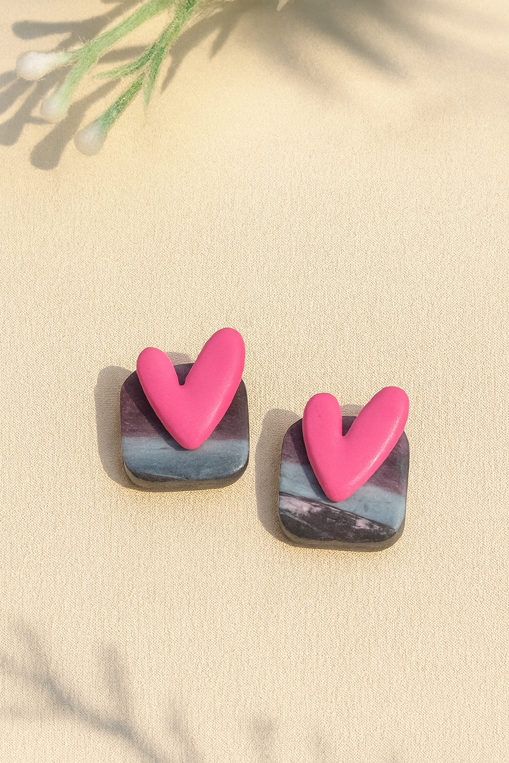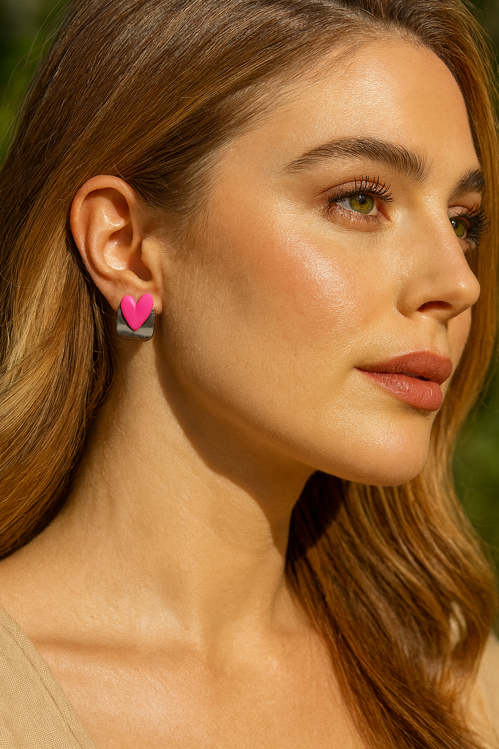 The Vionne earrings capture the beauty of contrast in a playful, modern composition. A bold fuchsia heart rests atop a marbled base in soft tones, creating a piece that balances tenderness and contemporary design. Their geometric yet expressive aesthetic turns them into a statement of creativity and individuality.