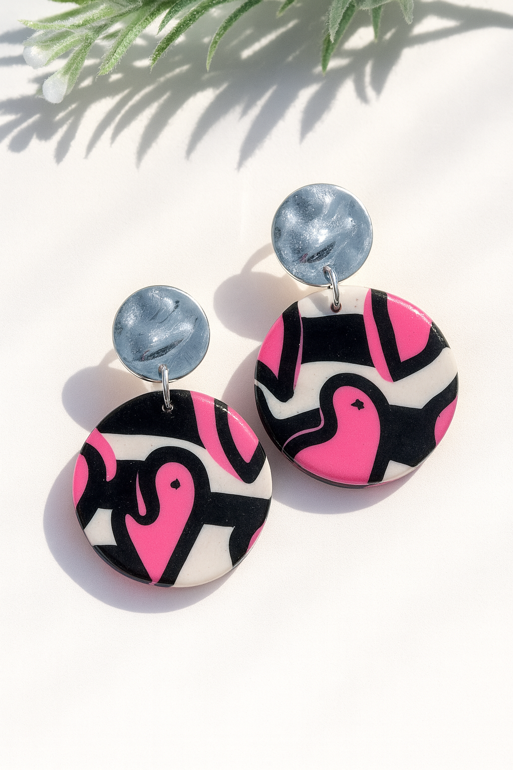 The Zavira earrings celebrate creativity and self-expression through striking design and color. Featuring a bold abstract pattern in fuchsia, black, and ivory tones, they embody modern energy and fearless style. Their round shape and contemporary aesthetic make them the perfect accessory for those who see fashion as a form of art.